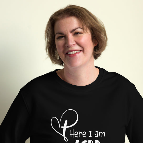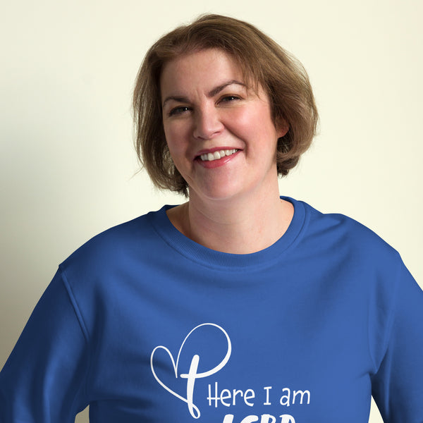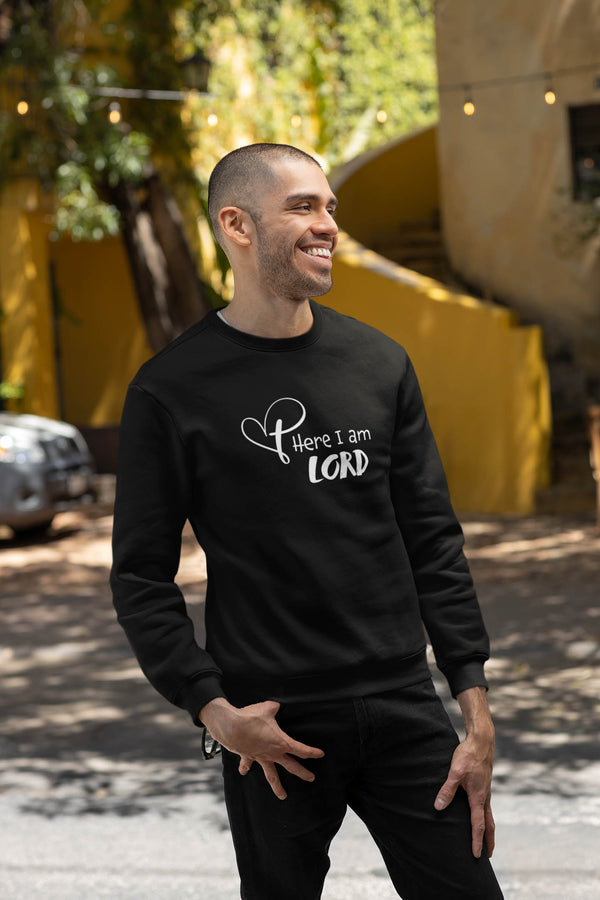 Here I am Lord adorns our unisex organic sweatshirt made of organic and recycled materials. This oh-so-comfy sweat feels soft and cozy to the touch. It has set-in sleeves, 2×2 rib at collar, and a self-fabric neck tape. Order this eco-friendly essential and hit the streets in style!