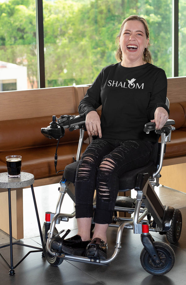 Wearing our must have fall/winter long-sleeve tee with the Shalom Peace Dove design tells the world that you embrace the concept of peace. Further, you're embracing the meaning of Shalom as it relates to the idea of wholeness, completeness, and well-being in all aspects of life—physical, spiritual, emotional, and social.