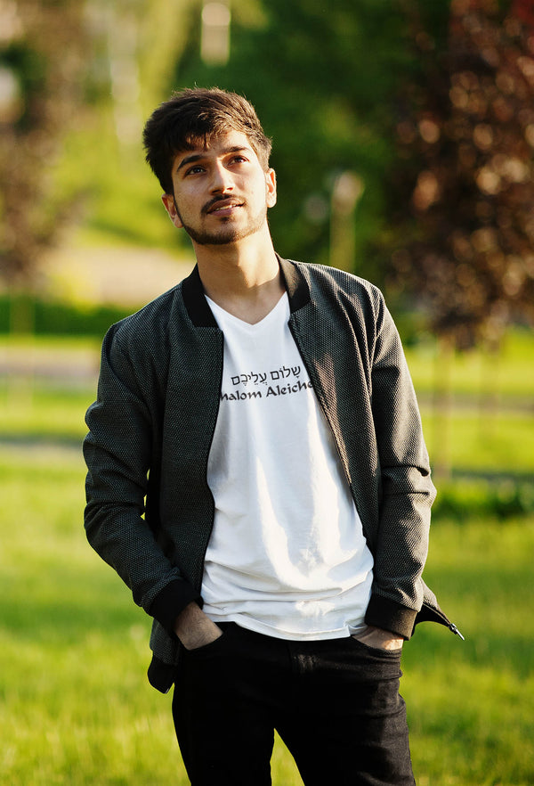Shalom Aleichem, "peace be unto you," written in English and Hebrew adorns a well-loved favorite unisex tee with a classic v-neck cut.